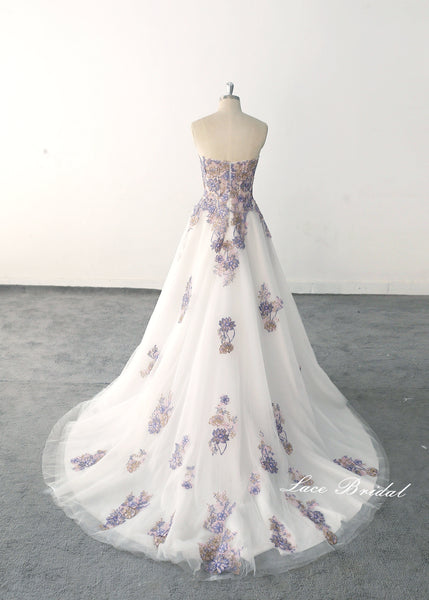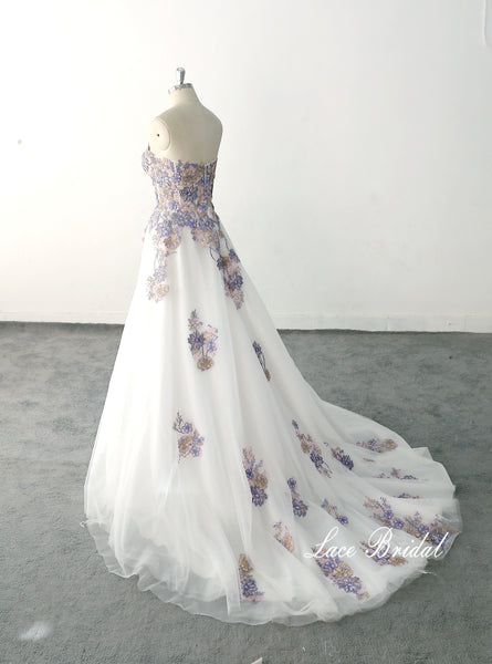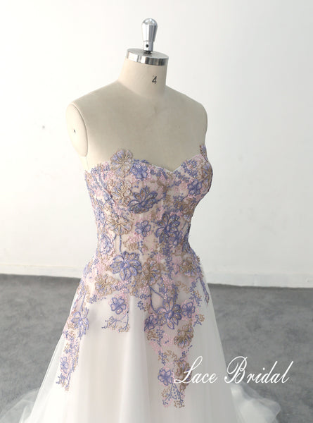 Elevate your bridal vision with this exquisite ivory wedding dress, masterfully crafted with intricate purple and gold lace detailing. Each custom-made gown is tailored to your precise measurements and preferences, ensuring a flawless fit that celebrates your unique style. The luxurious lace overlay combines timeless elegance with sophisticated color accents, creating a striking focal point that photographs beautifully. Perfect for brides seeking a distinctive alternative to traditional white, this bespoke design offers unparalleled quality and personalized attention to detail. Transform your wedding day with a dress as individual as you are.