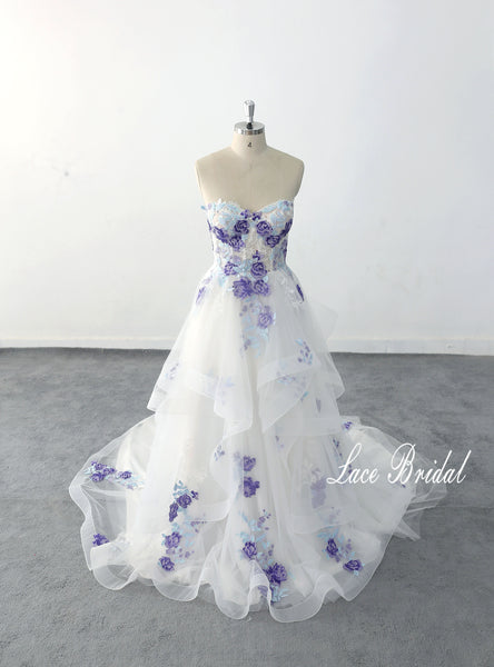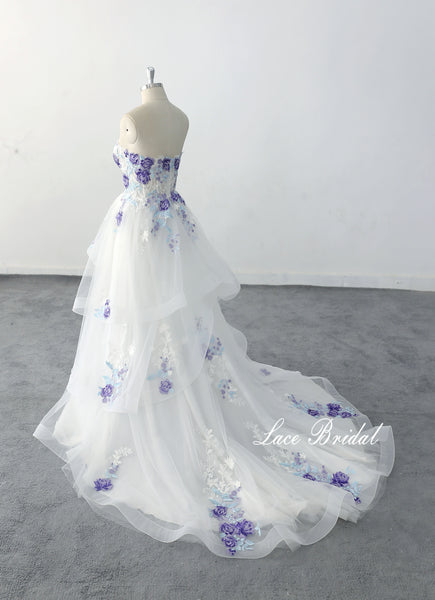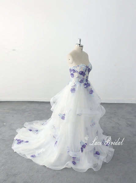 Elevate your bridal vision with this exquisite custom-made wedding dress, featuring an ivory silk foundation adorned with intricate sky blue and light purple lace detailing. Delicate floral embellishments seamlessly blend the complementary hues, creating a sophisticated and romantic aesthetic. Each piece is meticulously crafted to your specifications, ensuring a perfect fit and personalized design that reflects your unique style. The combination of soft pastels against the classic ivory base offers a modern twist on traditional bridal elegance, making this gown an unforgettable choice for your special day.