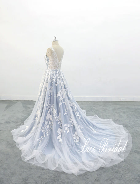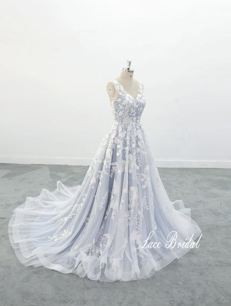 Elevate your bridal vision with this sophisticated light gray-blue wedding dress, expertly crafted in delicate lace. This custom-made gown combines timeless elegance with modern sensibility, featuring intricate lace detailing that creates an ethereal silhouette. The soft gray-blue hue offers a distinctive alternative to traditional white, flattering a range of skin tones while maintaining classic bridal grace. Fully customizable to your specifications, this dress ensures a perfect fit and personalized design that reflects your individual style. Ideal for the discerning bride seeking something truly unique and refined.